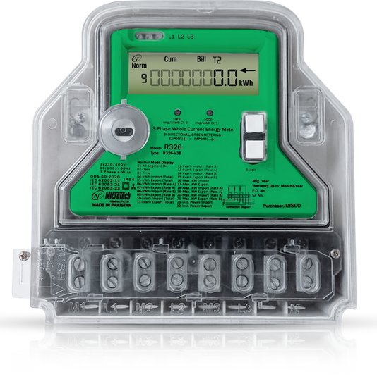R326-V3B is a state of the art Static Three Phase Energy Meter that allows the consumer to utilize the Green Energy Resources by using the concept of Net-Metering. The Energy Meter complies with relevant International Standards along with the specifications laid down by NTDC/ WAPDA Pakistan. The energy meter can facilitate the concept of electricity production by the consumer (using Solar Panels) and selling/exporting the surplus electricity to DISCOs/ utility. The facility of Net Metering is available in All DISCOs and K-Electric Customers under Net Metering (NM) regulation by NEPRA in “Distributed Generation and Net Metering Regulations”, 2015. The energy meter is approved by WAPDA Specifically for Net-Metering application.